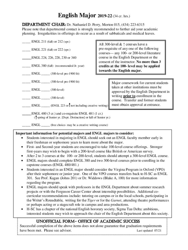 English Major 201922 (34 cr. hrs.) Department Chair: Dr. Nathaniel D. Perry, Morton 015, (434) 2236315 Please note that departmental contact is strongly recommended to further aid your academic planning.