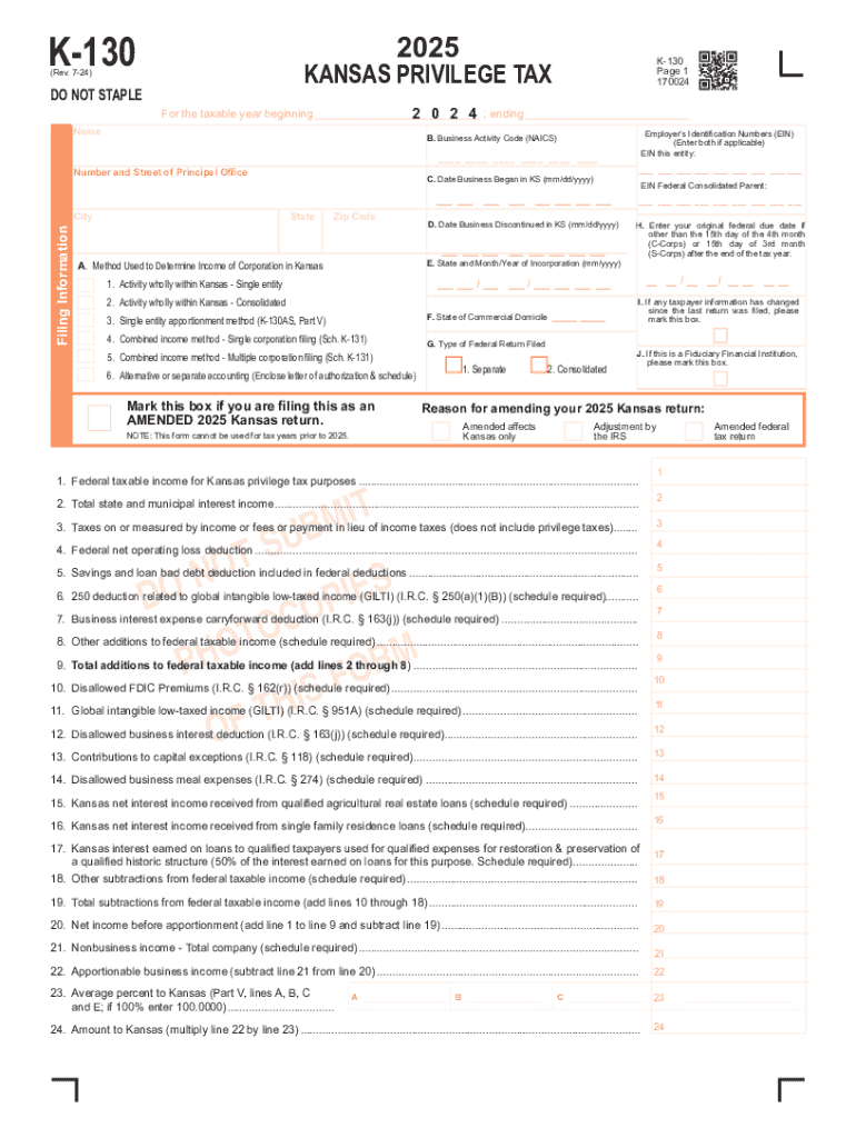 The K-130 form is used by corporations to report and pay the Kansas Privilege Tax for the taxable year. It includes information about the corporation\'s income, deductions, credits, and amounts owed to the state of Kansas. The form requires various details about the corporation\'s business activities and financial status, along with specific computations for tax liability.