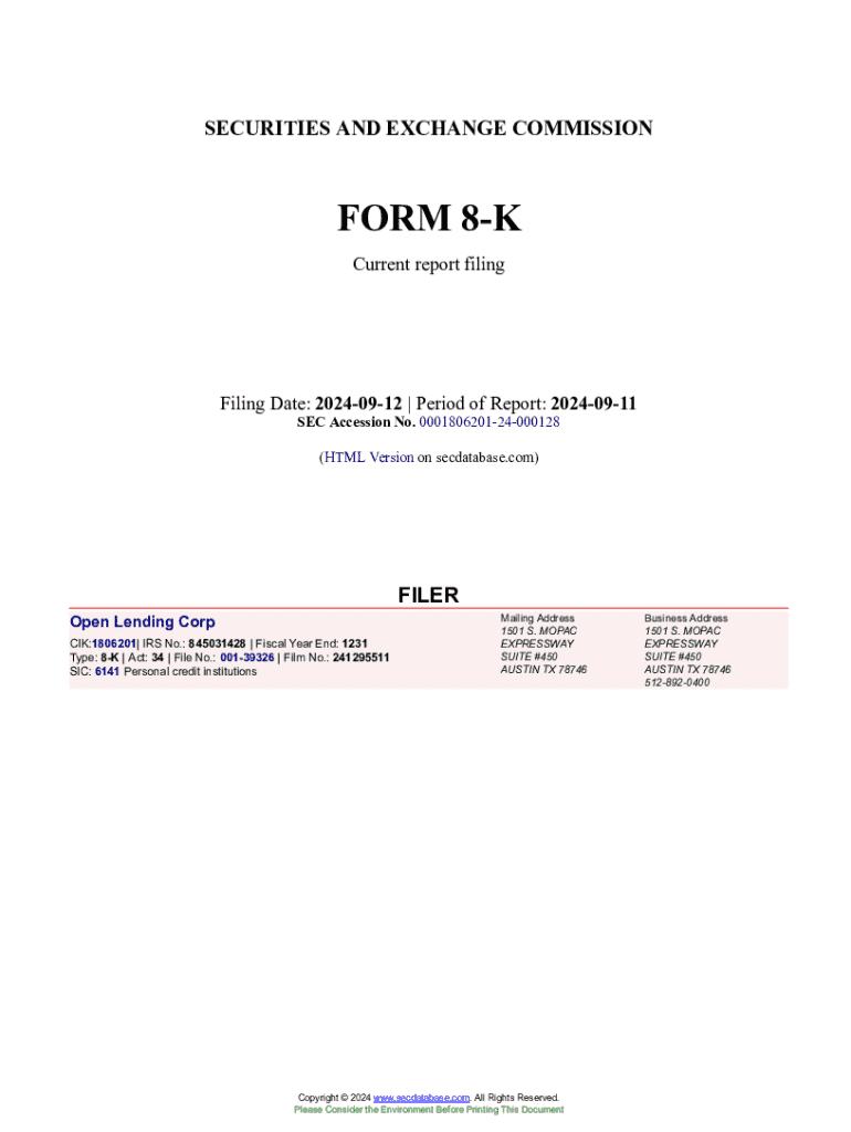 SECURITIES AND EXCHANGE COMMISSIONFORM 8K Current report filingFiling Date: 20240912 | Period of Report: 20240911 SEC Accession No. 000180620124000128 (HTML Version on secdatabase.com)FILER Open Lending