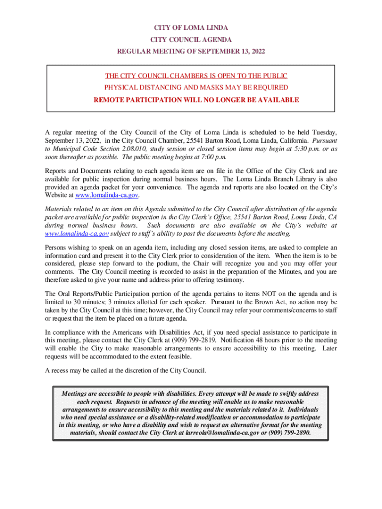 The document outlines the agenda for the regular City Council meeting of Loma Linda scheduled on September 13, 2022. It includes details such as the meeting\'s location, timings, public participation guidelines, and items for discussion including tree removal requests and updates to the Hotel Incentive Program.