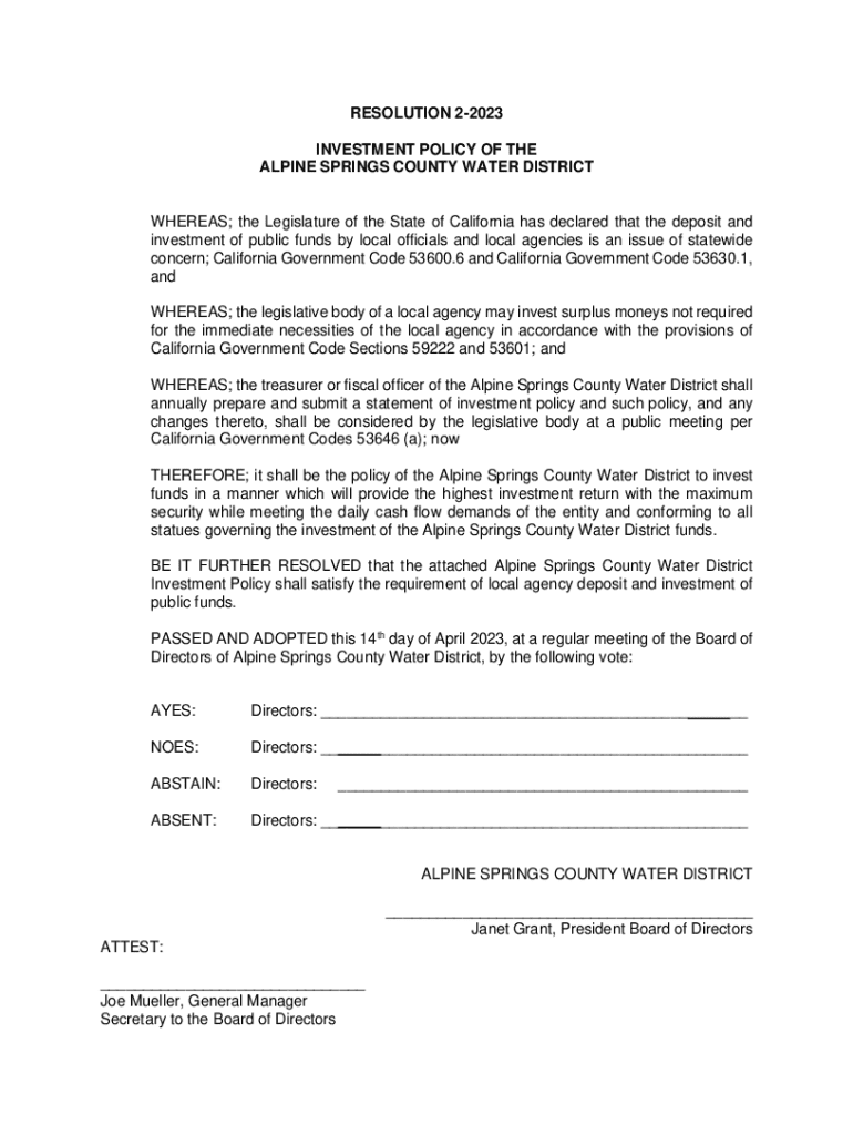 RESOLUTION 22023 INVESTMENT POLICY OF THE ALPINE SPRINGS COUNTY WATER DISTRICTWHEREAS; the Legislature of the State of California has declared that the deposit and investment of public funds by local