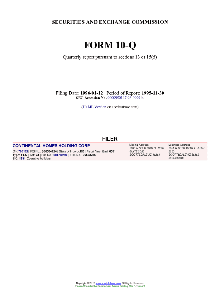 This document is a quarterly report filed by Continental Homes Holding Corp. with the SEC, covering financial information for the period ended November 30, 1995. It contains comprehensive financial statements, management discussions, and details regarding the company\'s operations, including income statements, balance sheets, and cash flows.