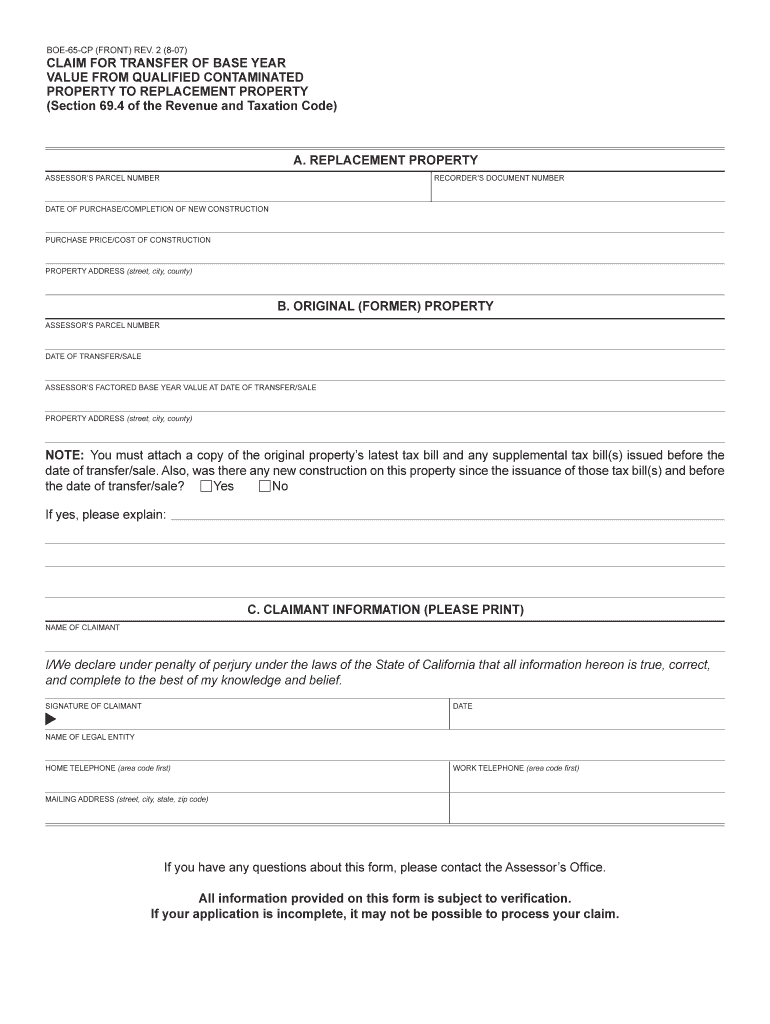 BOE-65-CP (FRONT) REV. 2 (8-07) CLAIM FOR TRANSFER OF BASE YEAR VALUE FROM QUALIFIED CONTAMINATED PROPERTY TO REPLACEMENT PROPERTY (Section 69.4 of the Revenue and Taxation Code) A. REPLACEMENT PROPERTY