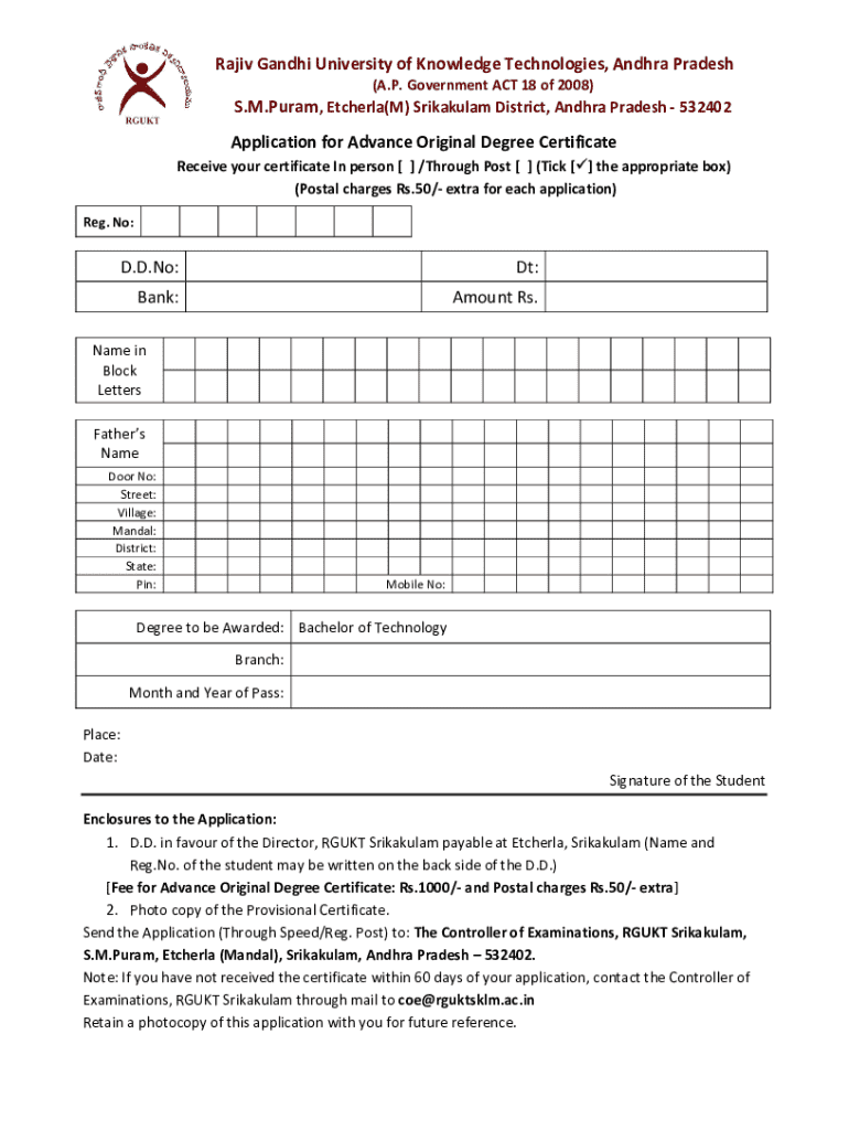 Get the free Application for Advance Original Degree Certificate Rajiv Gandhi ...
