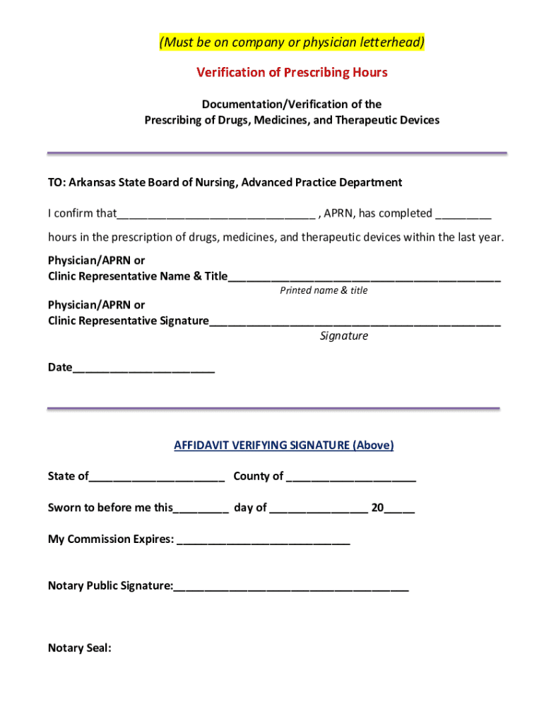 This document serves as a verification form for an Advanced Practice Registered Nurse (APRN) to confirm the number of prescribing hours completed in a year for drugs, medicines, and therapeutic devices. It is intended for submission to the Arkansas State Board of Nursing, along with required signatures and notarization.