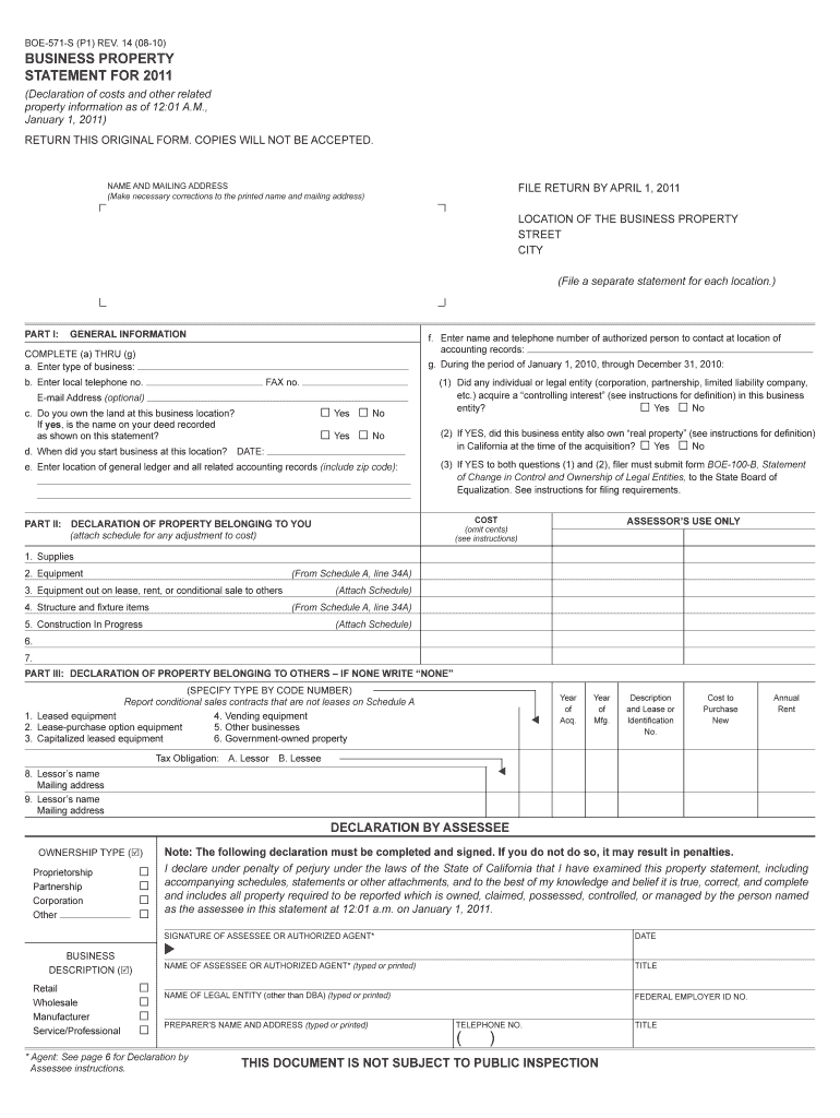 BOE-571-S (P1) REV. 14 (08-10) BUSINESS PROPERTY STATEMENT FOR 2011 (Declaration of costs and other related property information as of 12:01 A.M., January 1, 2011) RETURN THIS ORIGINAL FORM. COPIES