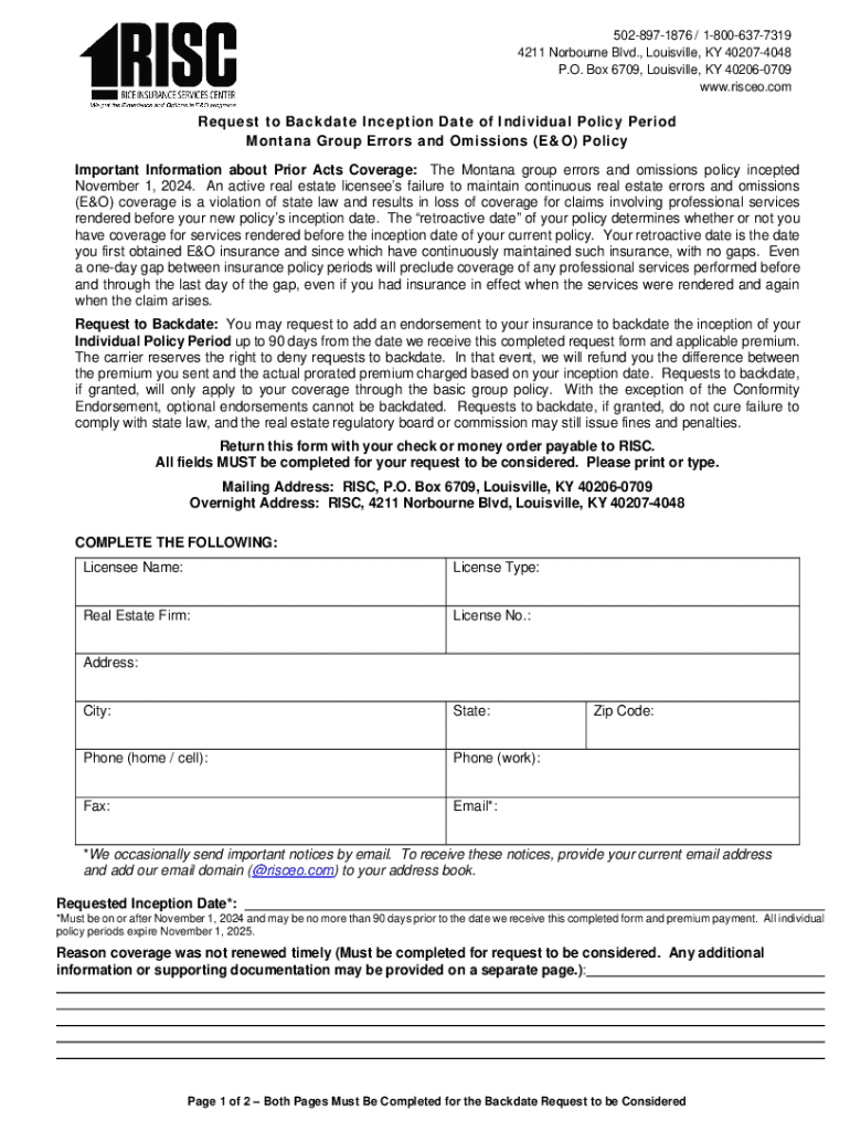 This form is used by licensed real estate professionals to request the backdating of their Errors and Omissions (E&O) insurance policy inception date. It outlines important information regarding coverage, compliance with state laws, and the necessary details to be completed for the request to be considered. The backdated endorsement applies to the group policy for the Montana real estate licensees.