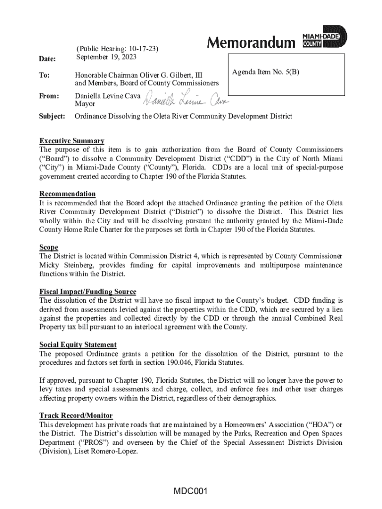 This ordinance seeks to gain authorization from the Board of County Commissioners to dissolve the Oleta River Community Development District located in North Miami, Florida. The district was established for specific public infrastructure financing but is no longer needed as the developer can obtain funding through private means. The ordinance details the reasons for dissolution, fiscal implications, and the statutory authority under which the district may be dissolved.