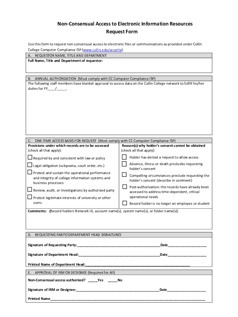 This form is used to request non-consensual access to electronic files or communications in accordance with Collin College\'s Computer Compliance ISP. It outlines the necessary authorizations and justifications for accessing data without the holder\'s consent, including reasons related to legal obligations, operational needs, or other compelling circumstances.