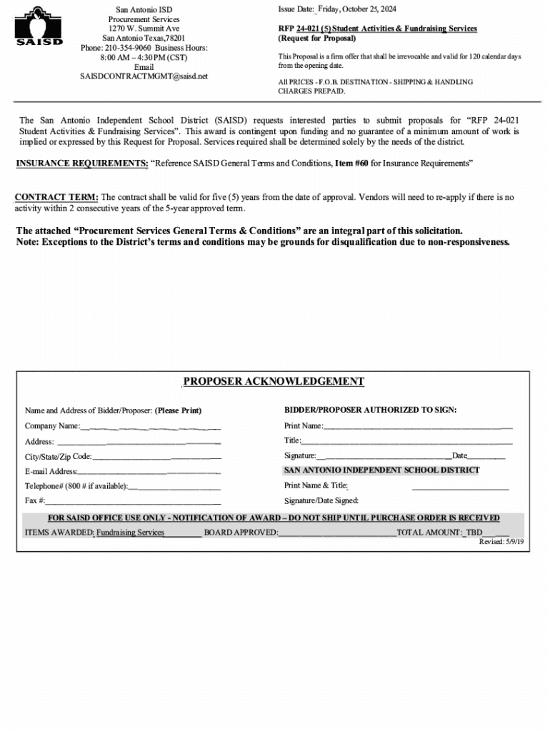 This document details the Request for Proposal (RFP) issued by the San Antonio Independent School District (SAISD) for Student Activities and Fundraising Services. It outlines the requirements for submission, conditions for award, insurance requirements, and evaluation criteria for selecting a vendor to provide these services over a five-year contract term.
