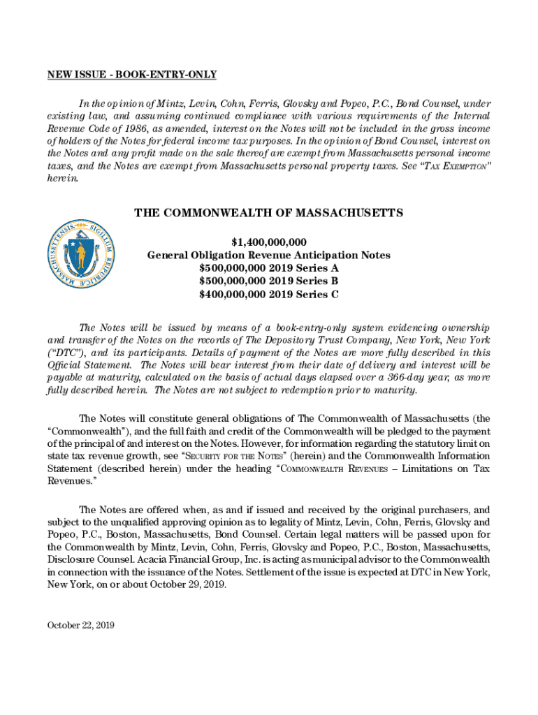 NEW ISSUE BOOKENTRYONLY In the opinion of Mintz, Levin, Cohn, Ferris, Glovsky and Popeo, P.C., Bond Counsel, under existing law, and assuming continued compliance with various requirements of the