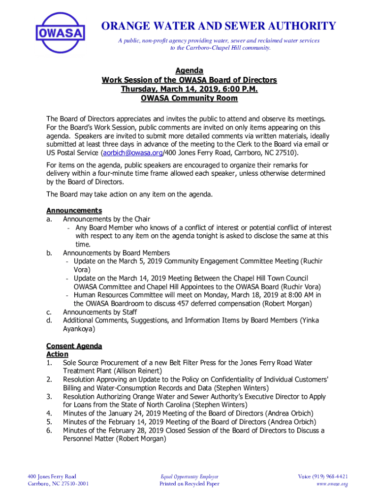 ORANGE WATER AND SEWER AUTHORITY A public, nonprofit agency providing water, sewer and reclaimed water services to the CarrboroChapel Hill community.Agenda Work Session of the OWASA Board of Directors