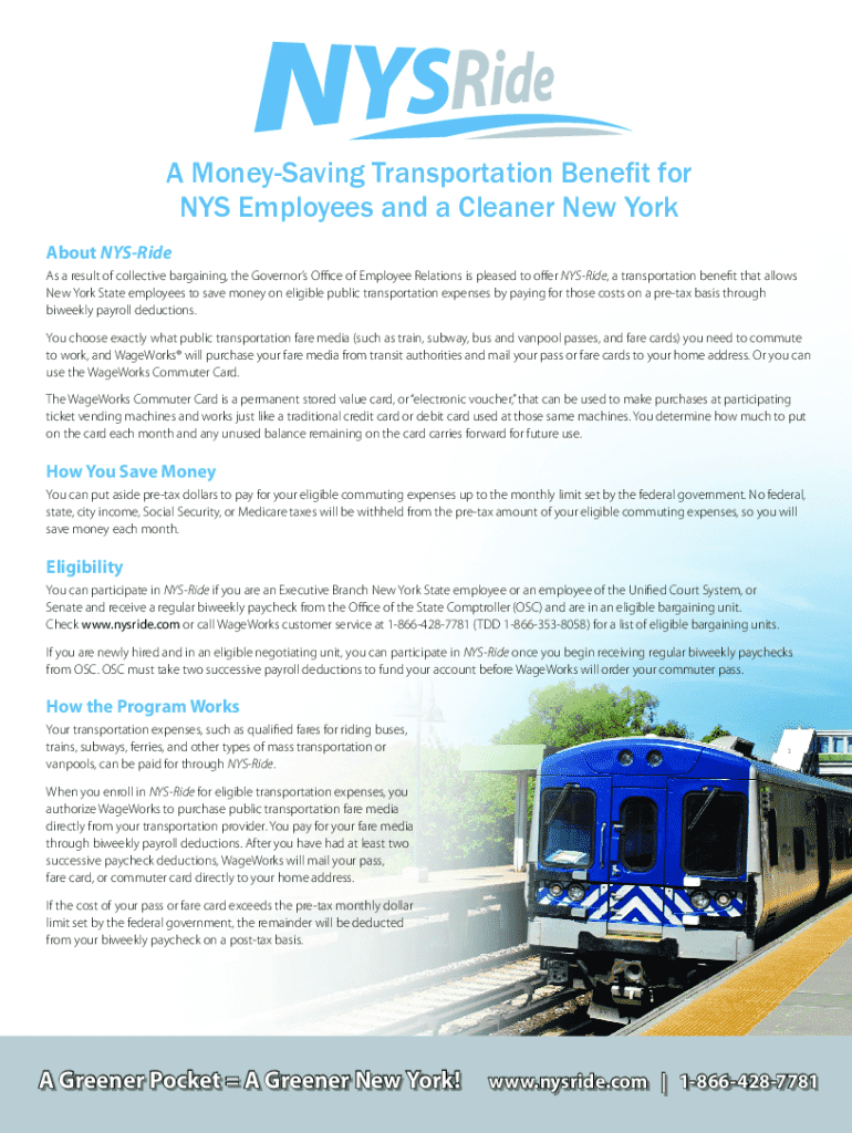 A MoneySaving Transportation Benefit for NYS Employees and a Cleaner New York About NYSRide As a result of collective bargaining, the Governors Office of Employee Relations is pleased to offer NYSRide,