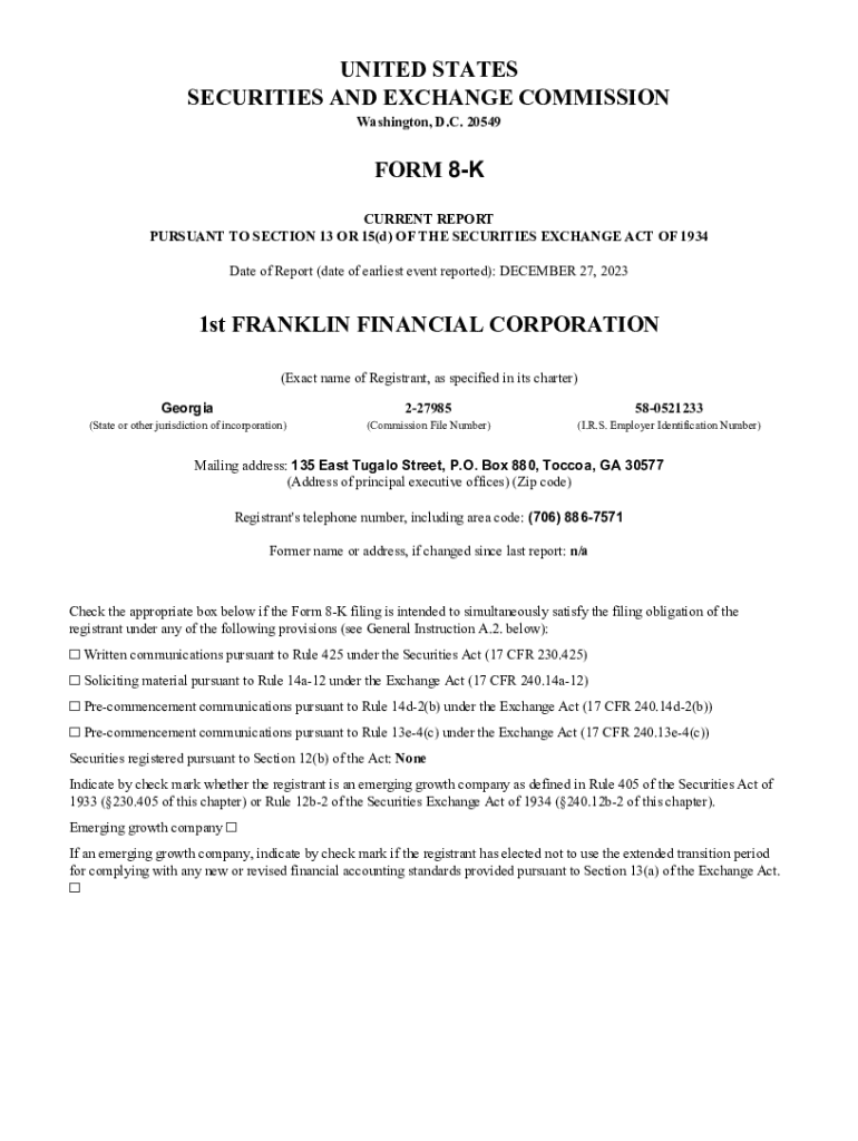 This document is a current report filed by 1st Franklin Financial Corporation to disclose the entry into a Sixth Amendment to the Amended and Restated Loan and Security Agreement. The report outlines key details about the amendment, including changes to prepayment terms, the acknowledgment of indebtedness, and compliance requirements for a bulk purchase of receivables.