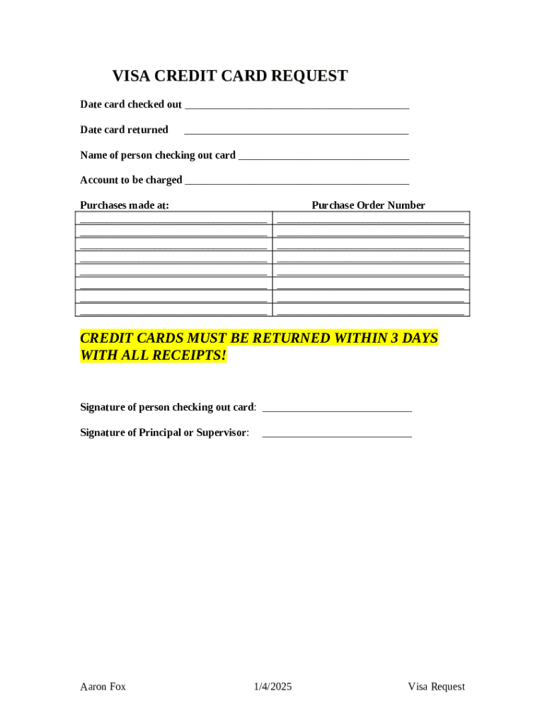 The Visa Credit Card Request is a Word document that should be submitted to the required address to provide specific info. It must be completed and signed, which is possible in hard copy, or with the help of a particular solution such as PDFfiller. It helps to complete any PDF or Word document right in the web, customize it depending on your purposes and put a legally-binding electronic signature. Right away after completion, you can send the Visa Credit Card Request to the relevant recipient, or multiple recipients via email or fax. The blank is printable too because of PDFfiller feature and options presented for printing out adjustment. Both in digital and in hard copy, your form should have a organized and professional appearance. You can also save it as the template for further use, so you don't need to create a new blank form from scratch. Just amend the ready form.