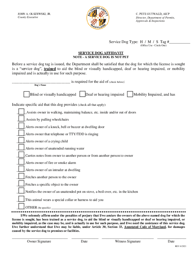 C. PETE GUTWALD, AICP Director, Department of Permits, Approvals & InspectionsJOHN A. OLSZEWSKI, JR. County ExecutiveService Dog Type: H / M / S Tag #___ (Office Use Circle One)SERVICE DOG AFFIDAVIT