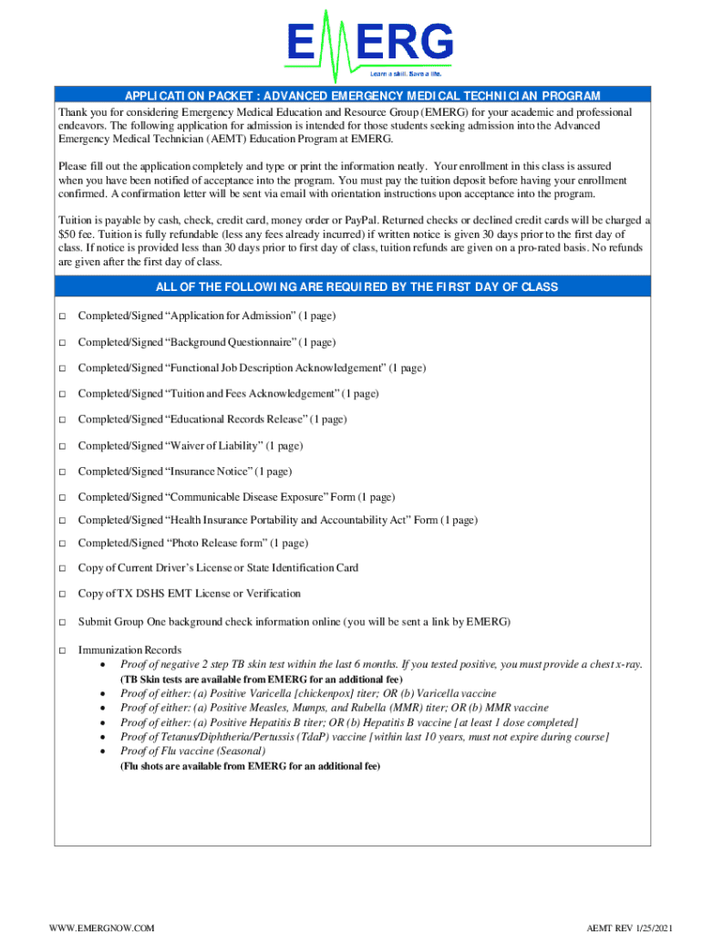 APPLICATION PACKET : ADVANCED EMERGENCY MEDICAL TECHNICIAN PROGRAM Thank you for considering Emergency Medical Education and Resource Group (EMERG) for your academic and professional endeavors. The