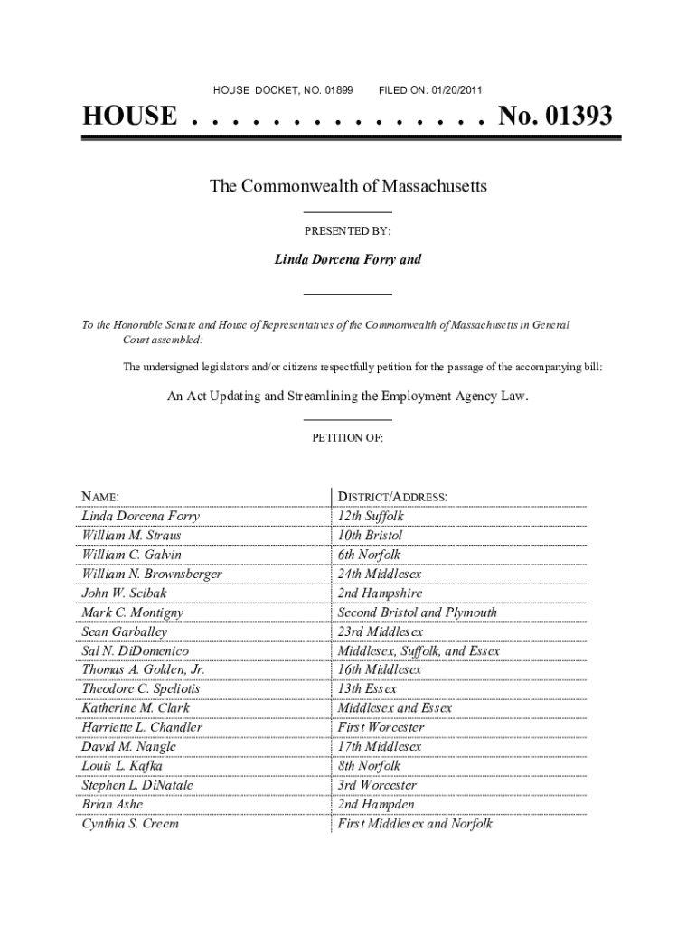 HOUSE DOCKET, NO. 01899FILED ON: 01/20/2011HOUSE . . . . . . . . . . . . . . . No. 01393 The Commonwealth of Massachusetts ___ PRESENTED BY:Linda Dorcena Forry and ___ To the Honorable Senate and