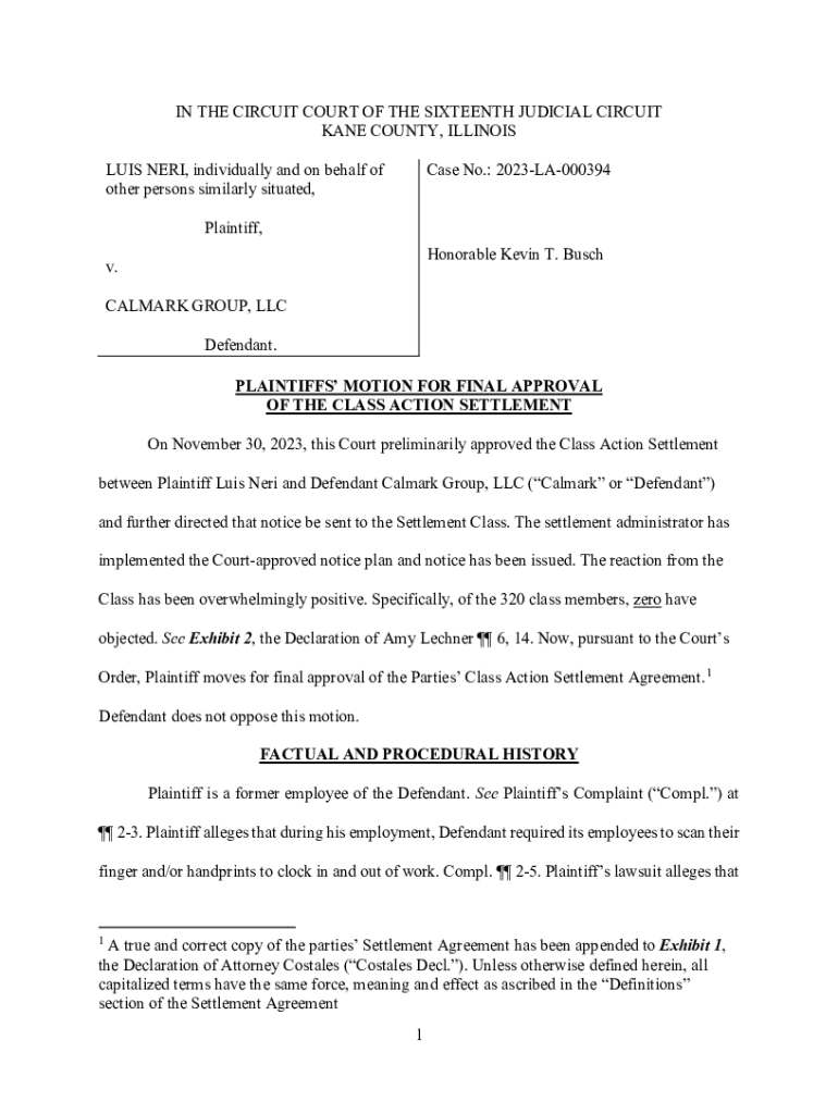 This document is a motion for final approval of a class action settlement concerning biometric data collection by Calmark Group, LLC. It details the terms of the settlement agreement, the class definition, the settlement fund established, and the process for class members to submit claims. It includes information about the court approval process, settlement relief, and the rights of class members.