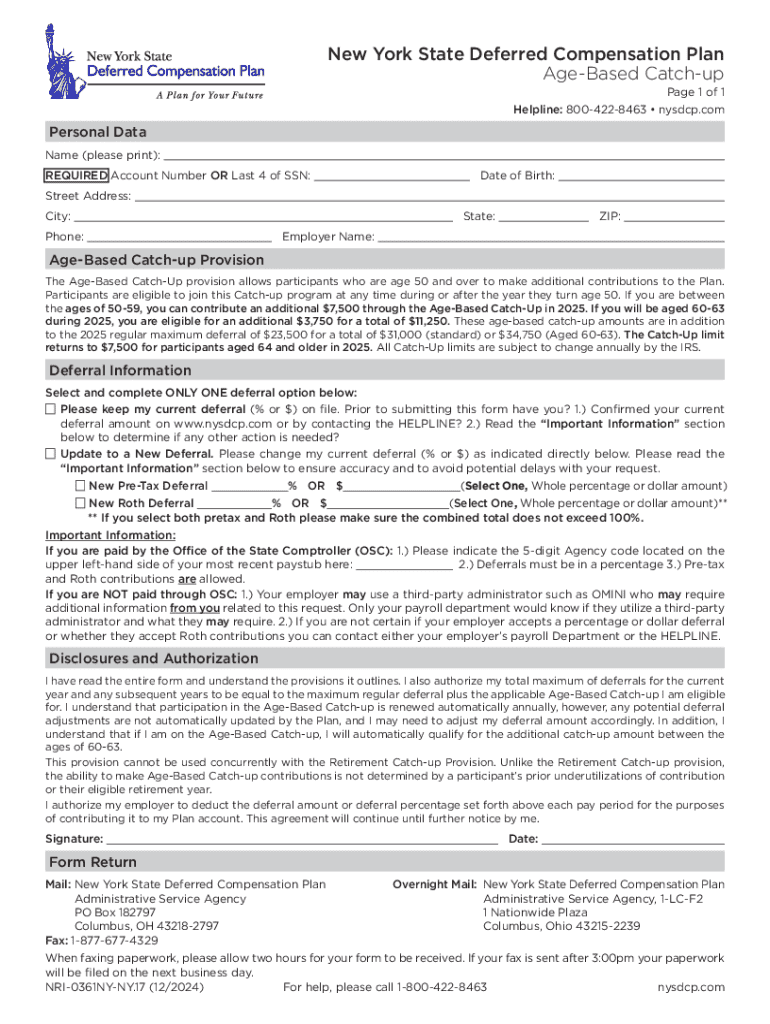 Get the free New York State Deferred Compensation Plan Age-based Catch-up
