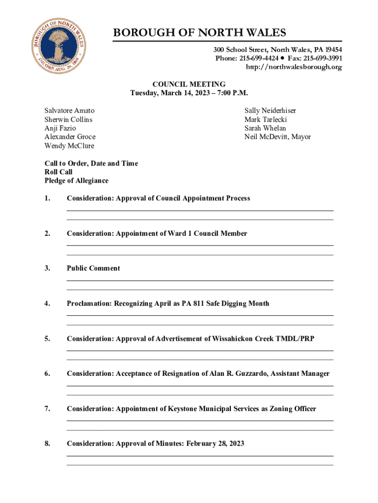 This document outlines the agenda for the North Wales Borough Council meeting scheduled on March 14, 2023. It includes agenda items such as the approval process for council appointments, public comments, various proclamations and considerations related to local governance, including the appointment of a new council member, a proclamation recognizing safe digging month, and updates on public works and zoning applications.
