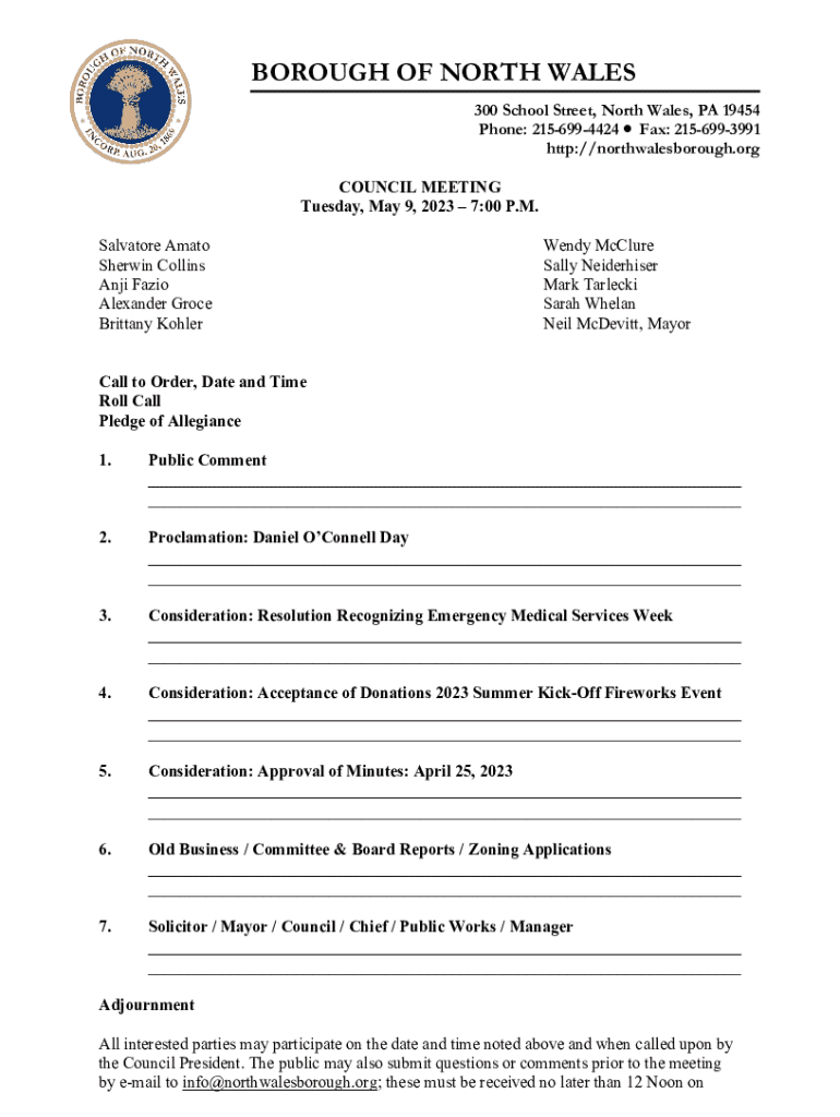 BOROUGH OF NORTH WALES 300 School Street, North Wales, PA 19454 Phone: 2156994424 Fax: 2156993991 http://northwalesborough.org COUNCIL MEETING Tuesday, May 9, 2023 7:00 P.M. Salvatore Amato Sherwin