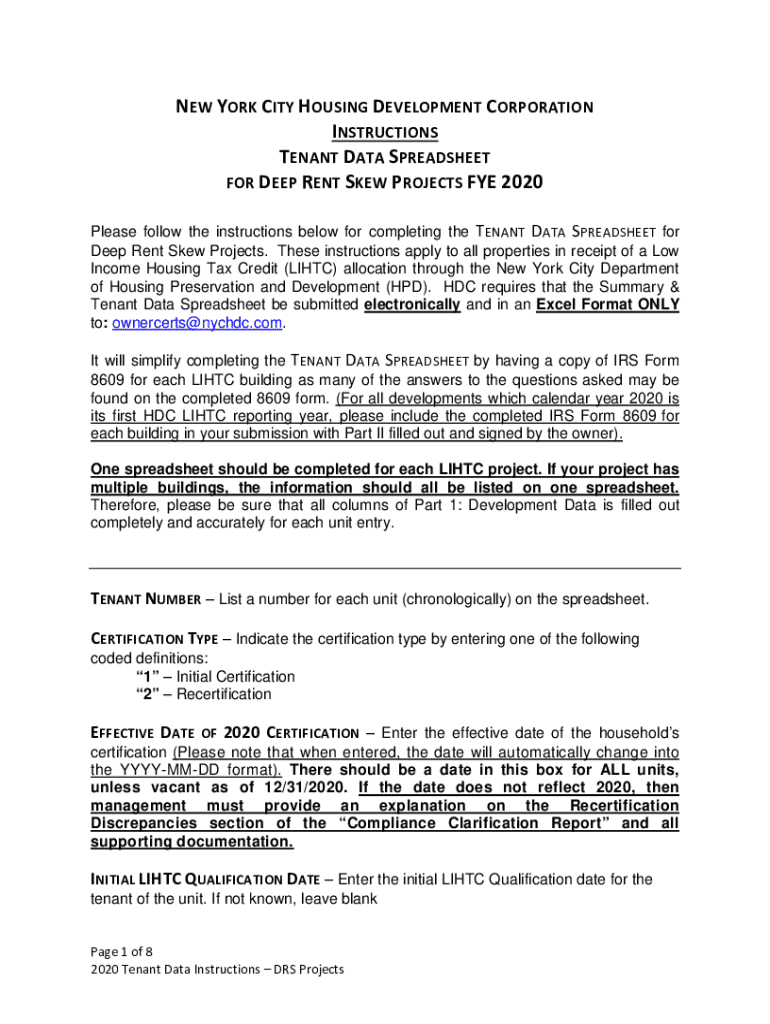 NEW YORK CITY HOUSING DEVELOPMENT CORPORATION INSTRUCTIONS TENANT DATA SPREADSHEET FOR DEEP RENT SKEW PROJECTS FYE 2020 Please follow the instructions below for completing the TENANT DATA SPREADSHEET