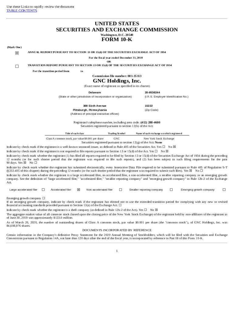 This document is the annual report of GNC Holdings, Inc. for the fiscal year ended December 31, 2019, filed with the SEC. It includes consolidated financial statements, management\'s discussion and analysis of financial condition, discussion of risk factors, and details on the company\'s operations, governance, and financial performance.
