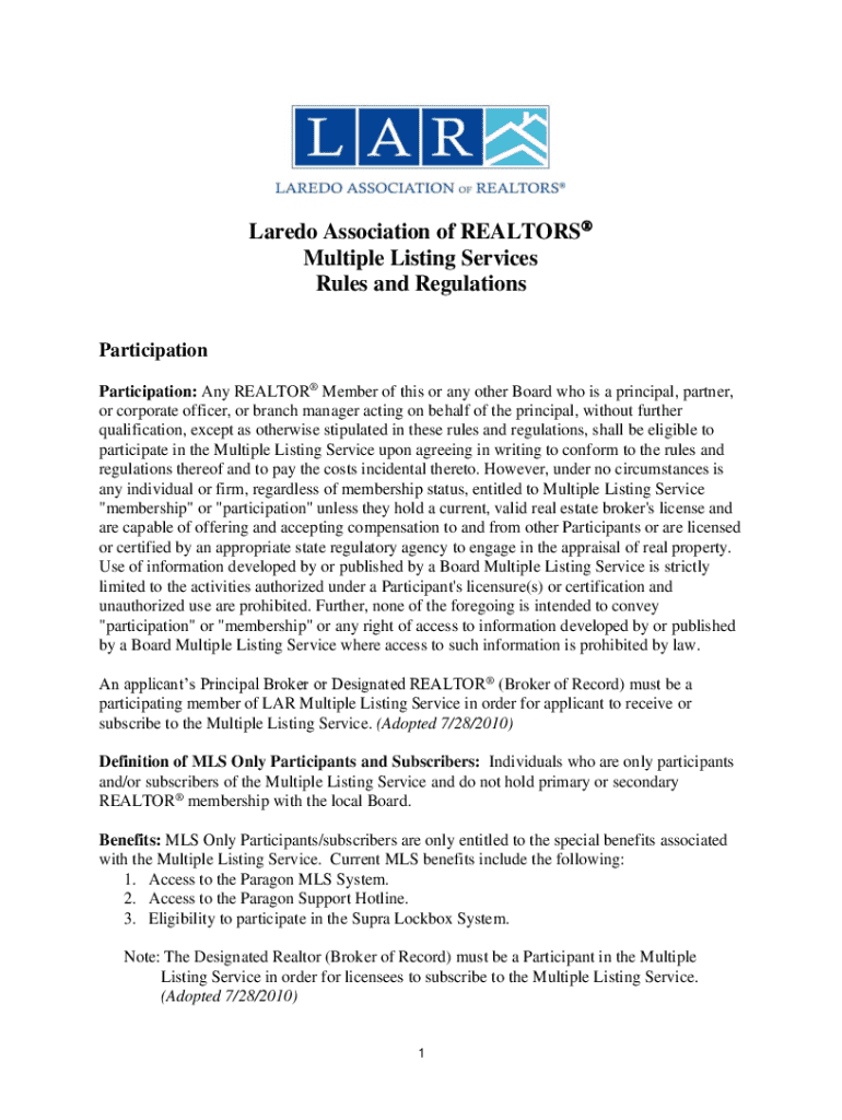 Laredo Association of REALTORS Multiple Listing Services Rules and Regulations Participation Participation: Any REALTOR Member of this or any other Board who is a principal, partner, or corporate