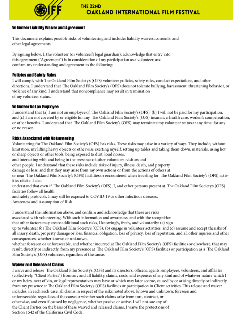 Volunteer Liability Waiver and Agreement This document explains possible risks of volunteering and includes liability waivers, consents, and other legal agreements. By signing below, I, the volunteer