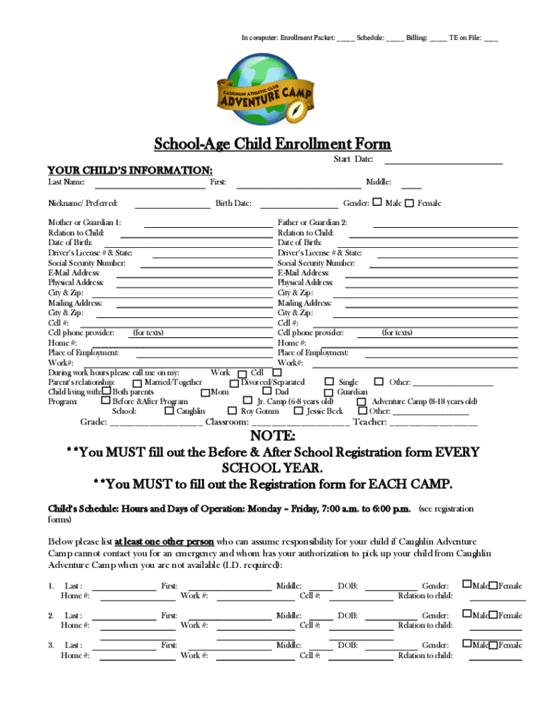 In computer: Enrollment Packet: ___ Schedule: ___ Billing: ___ TE on File: ___SchoolAge Child Enrollment Form Start Date:YOUR CHILDS INFORMATION: Last Name:First:Nickname/ Preferred:Middle:Birth Date:Mother