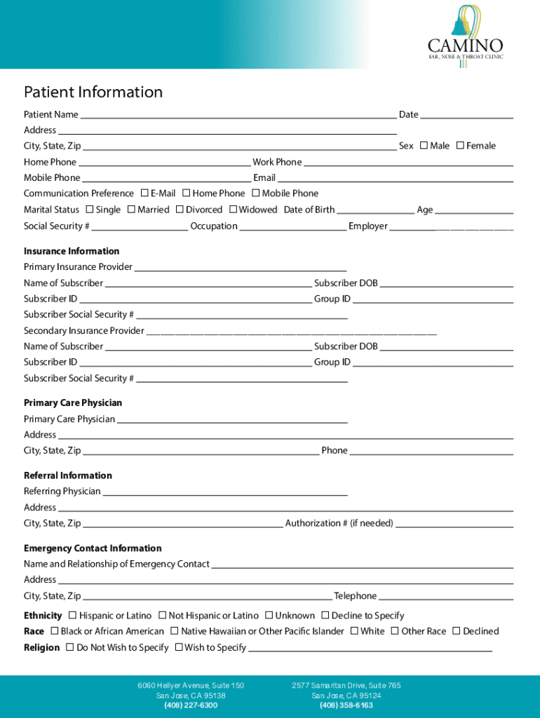 This document is a comprehensive patient information and health history form used by the Camino Ear, Nose & Throat Clinic. It collects essential personal details, medical history, insurance information, and acknowledges HIPAA consent for health information privacy practices.