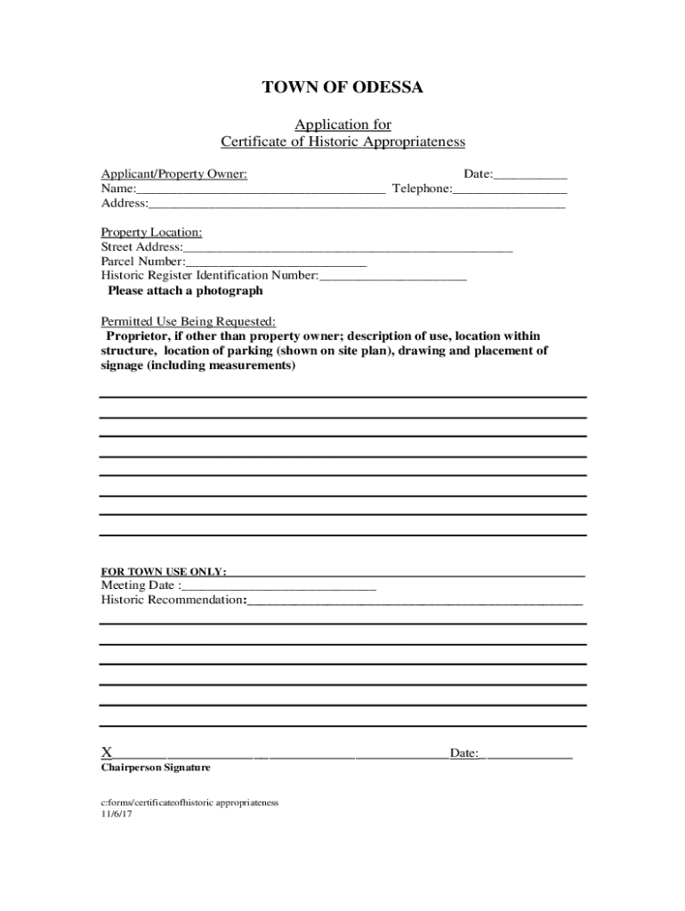 This document is an application form for obtaining a Certificate of Historic Appropriateness for properties within the Town of Odessa. It collects information about the applicant, property location, use being requested, and requires a photograph to be attached. This form is used for reviewing historic property modifications to ensure compliance with preservation standards.