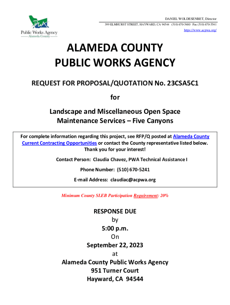 DANIEL WOLDESENBET, Director 399 ELMHURST STREET, HAYWARD, CA 94544 (510) 6705480 Fax (510) 6705541https://www.acpwa.org/ALAMEDA COUNTY PUBLIC WORKS AGENCY REQUEST FOR PROPOSAL/QUOTATION No. 23CSA5C1