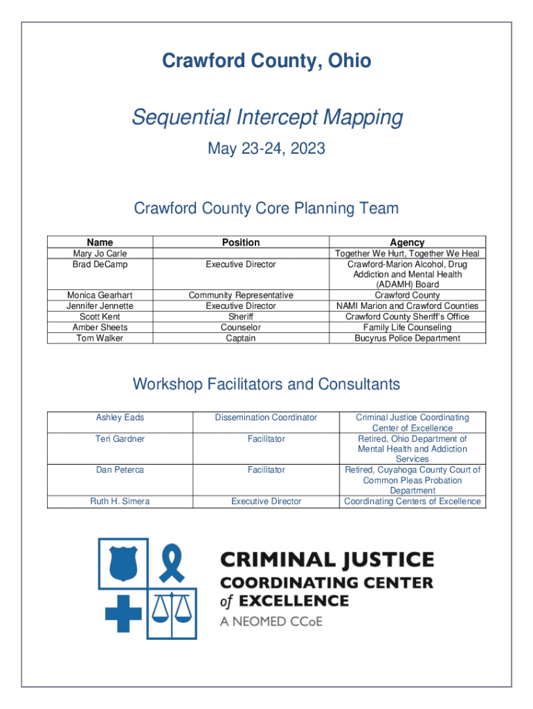 Crawford County, OhioSequential Intercept Mapping May 2324, 2023Crawford County Core Planning Team NamePositionMary Jo Carle Brad DeCampExecutive DirectorMonica Gearhart Jennifer Jennette Scott Kent