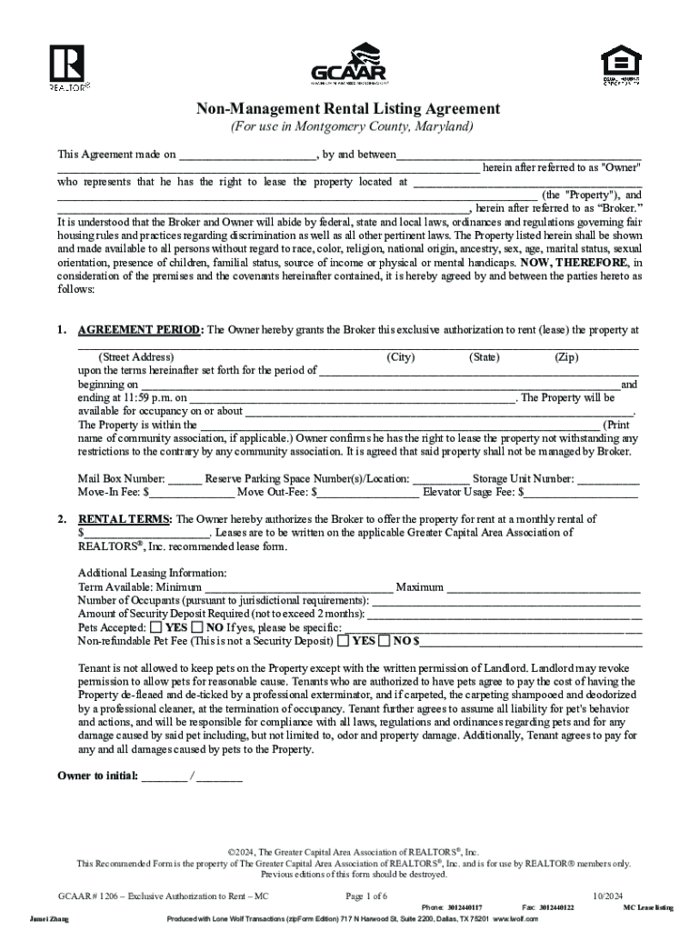 This document serves as a rental listing agreement between an owner and broker for leasing a property in Montgomery County, Maryland. It covers various aspects of the rental process, including rental terms, security deposits, marketing, and compliance with fair housing laws.