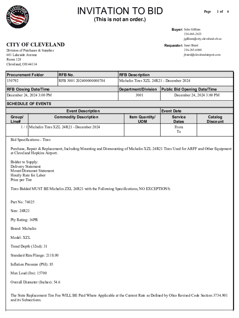 This document serves as an invitation to bid for the supply, repair, and replacement of Michelin Tires XZL 24R21 at Cleveland Hopkins Airport. The bid outlines specific requirements, submission guidelines, and evaluation criteria for interested bidders. The closing date for submissions is December 24, 2024.