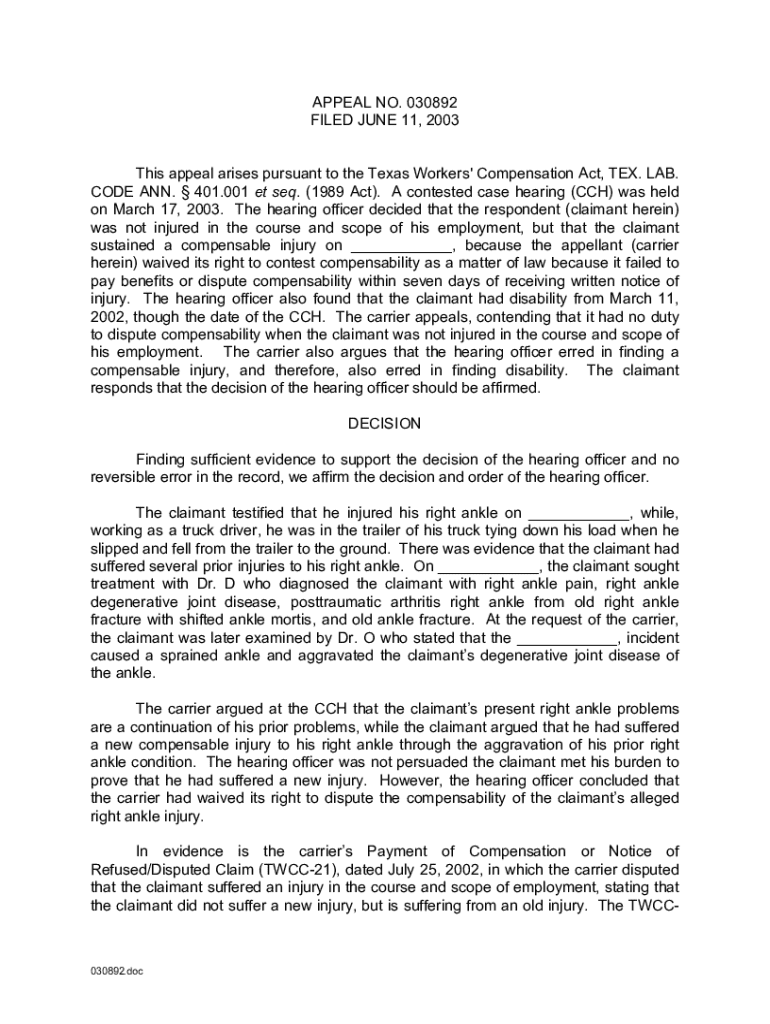 APPEAL NO. 030892 FILED JUNE 11, 2003 This appeal arises pursuant to the Texas Workers\' Compensation Act, TEX. LAB. CODE ANN. 401.001 et seq. (1989 Act). A contested case hearing (CCH) was held on