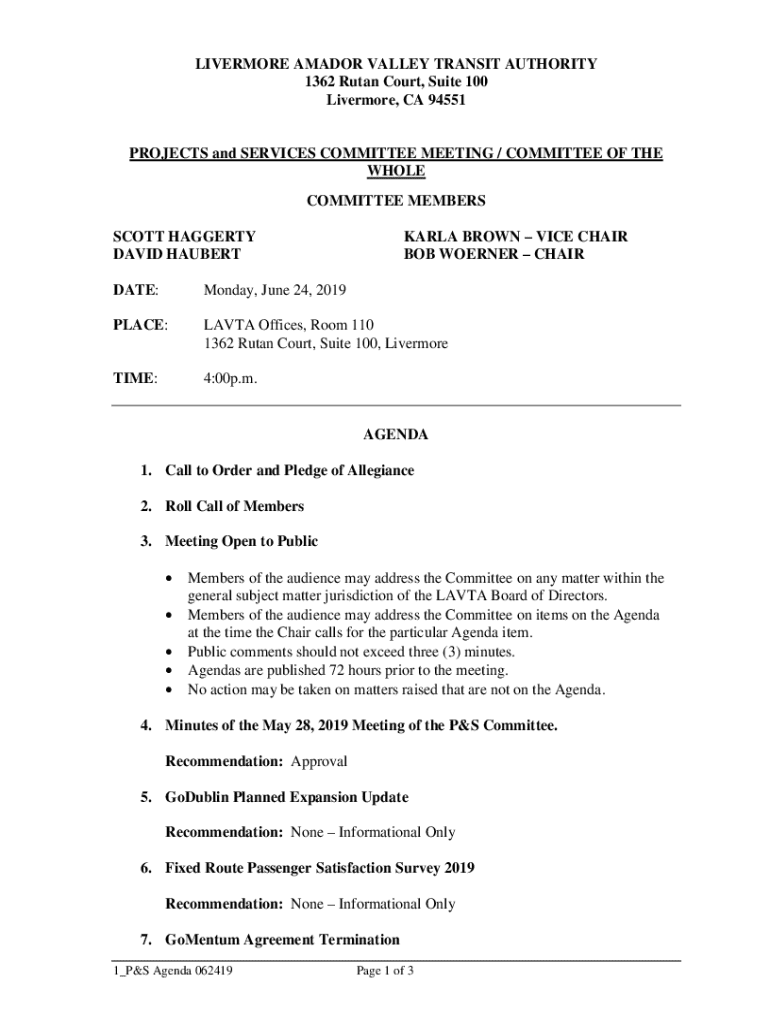 This document outlines the agenda for the Livermore Amador Valley Transit Authority (LAVTA) Projects and Services Committee meeting scheduled for June 24, 2019. It details various agenda items including public comments, previous meeting minutes, updates on planned expansions, satisfaction surveys, contract negotiations, and preliminary discussions about future committee items.