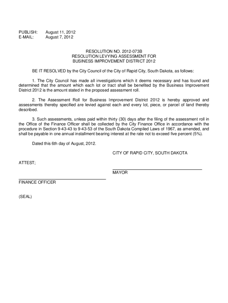 PUBLISH: EMAIL:August 11, 2012 August 7, 2012RESOLUTION NO. 2012073B RESOLUTION LEVYING ASSESSMENT FOR BUSINESS IMPROVEMENT DISTRICT 2012 BE IT RESOLVED by the City Council of the City of Rapid City,