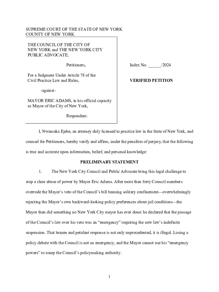 This document is a verified petition filed by the New York City Council and the New York City Public Advocate against Mayor Eric Adams, challenging his unilateral issuance of emergency orders that suspend the implementation of Local Law 42, which bans solitary confinement in City jails. The petition argues that the Mayor\'s actions constitute an abuse of power and seeks judicial intervention for the enforcement of Local Law 42.