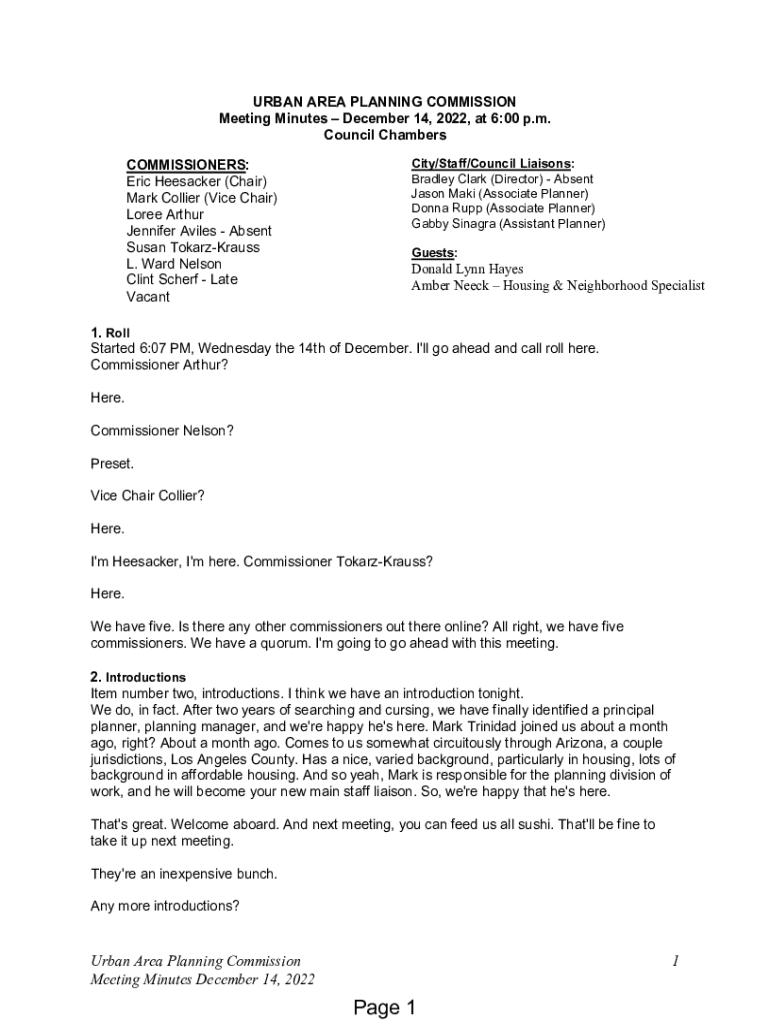 URBAN AREA PLANNING COMMISSION Meeting Minutes December 14, 2022, at 6:00 p.m. Council Chambers COMMISSIONERS: Eric Heesacker (Chair) Mark Collier (Vice Chair) Loree Arthur Jennifer Aviles Absent