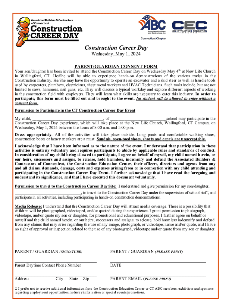 Construction Career Day Wednesday, May 1, 2024PARENT/GUARDIAN CONSENT FORMYour son/daughter has been invited to attend the Construction Career Day on Wednesday May 4th at New Life Church in Wallingford,
