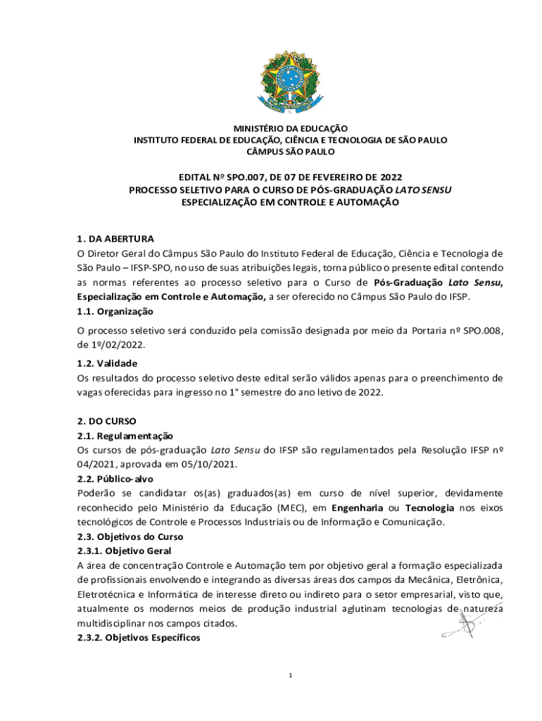MINISTRIO DA EDUCAO INSTITUTO FEDERAL DE EDUCAO, CINCIA E TECNOLOGIA DE SO PAULO CMPUS SO PAULOEDITAL No SPO.007, DE 07 DE FEVEREIRO DE 2022 PROCESSO SELETIVO PARA O CURSO DE PSGRADUAO LATO SENSU