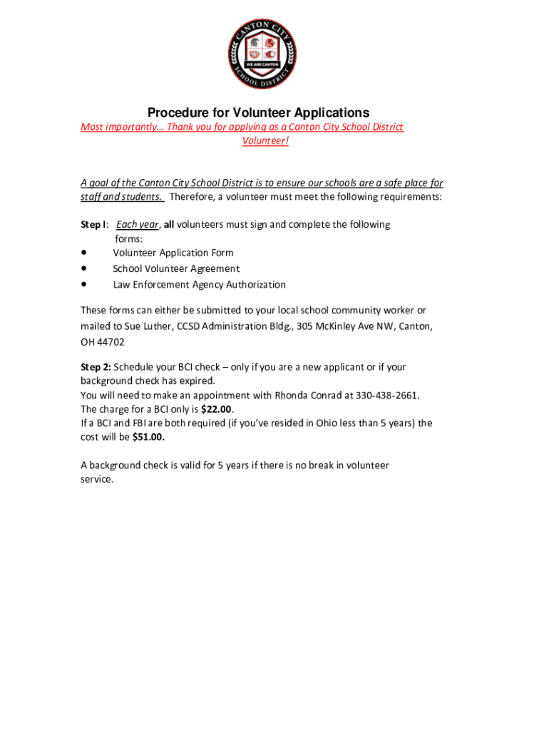 This document outlines the procedure for individuals interested in volunteering at Canton City School District. It details the required forms, background check process, and responsibilities of both volunteers and the school district.