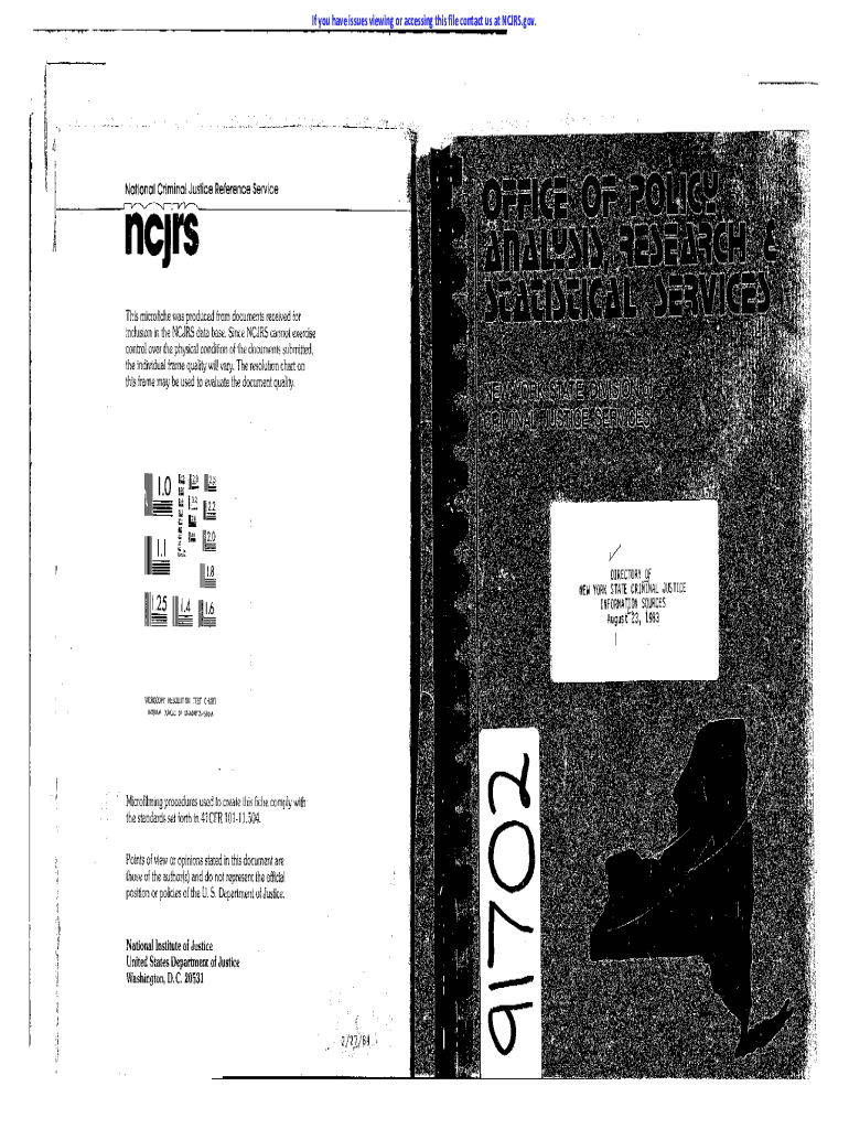 This document is a directory that informs criminal justice practitioners and scholars about the existence and locations of published research by criminal justice agencies operating in New York State. It includes agency entries, summaries of documents, and aims to facilitate the sharing of information among these agencies.