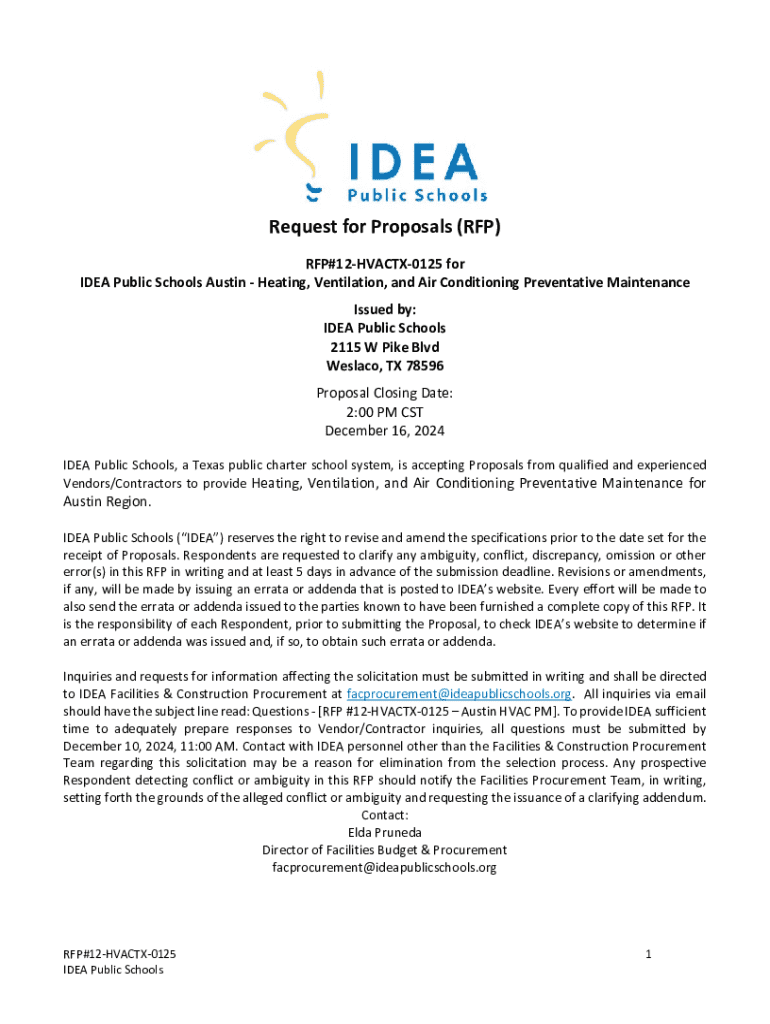 Request for Proposals (RFP) RFP#12HVACTX0125 for IDEA Public Schools Austin Heating, Ventilation, and Air Conditioning Preventative Maintenance Issued by: IDEA Public Schools 2115 W Pike Blvd Weslaco,