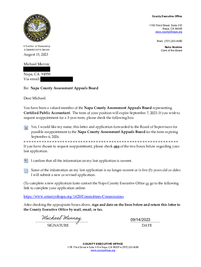 This document serves as a reappointment request for Michael Murray, a member of the Napa County Assessment Appeals Board representing Certified Public Accountant. It outlines the steps necessary for reappointment, including confirming the currency of prior application information and provides a link for submitting a new application if needed.