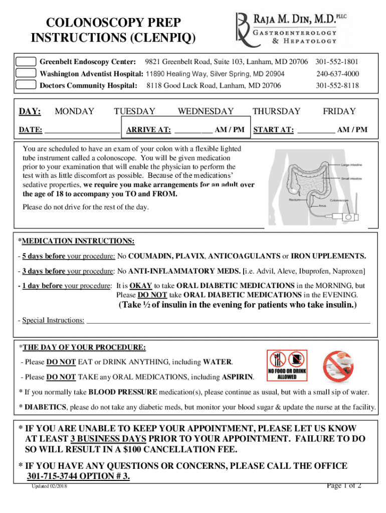Patients scheduled for a colonoscopy are required to follow and adhere to the preparation instructions involving Clenpiq.