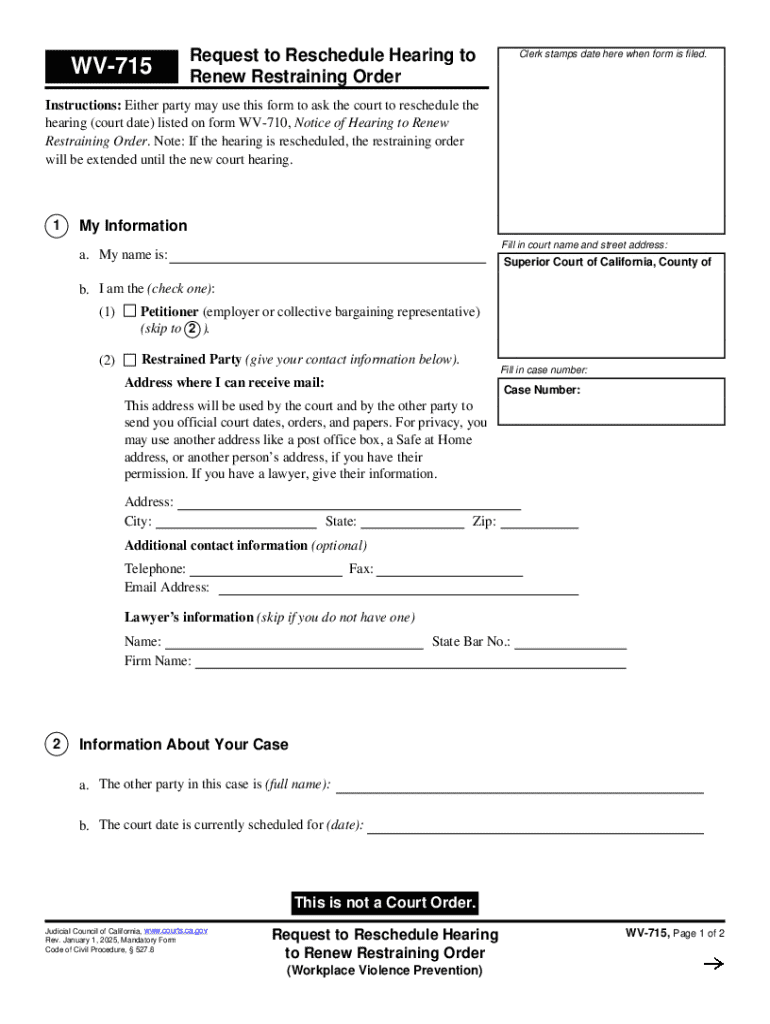 WV715Request to Reschedule Hearing to Renew Restraining OrderClerk stamps date here when form is filed.Instructions: Either party may use this form to ask the court to reschedule the hearing (court